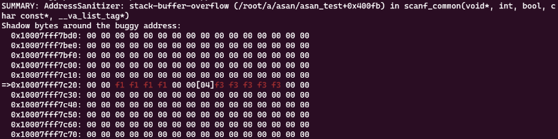 맨 위에 AddressSanitizer가 stack buffer overflow를 감지한 것을 알 수 있다.