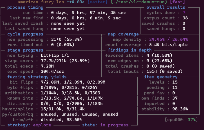 vlc-static binary를 직접 퍼징하려고 하면 AFL이 초당 몇 번만 실행된다는 것을 알 수 있다. VLC를 시작하려면 시간이 많이 걸리기 때문이다. 그래서 VLC를 퍼징하기 위한 맞춤 퍼징 harness를 만드는 것이 좋다.