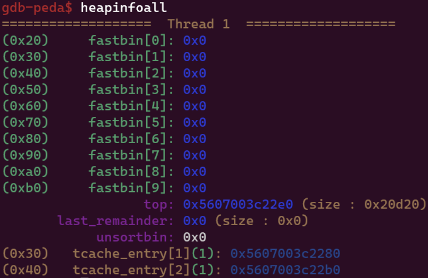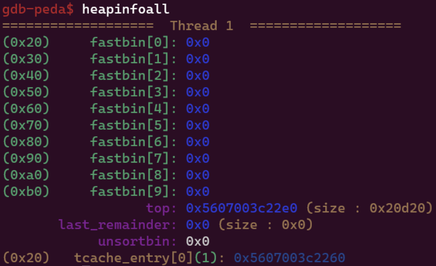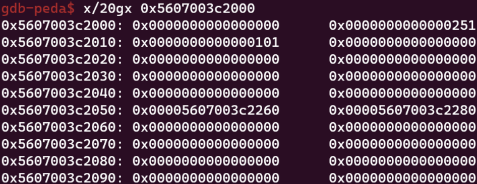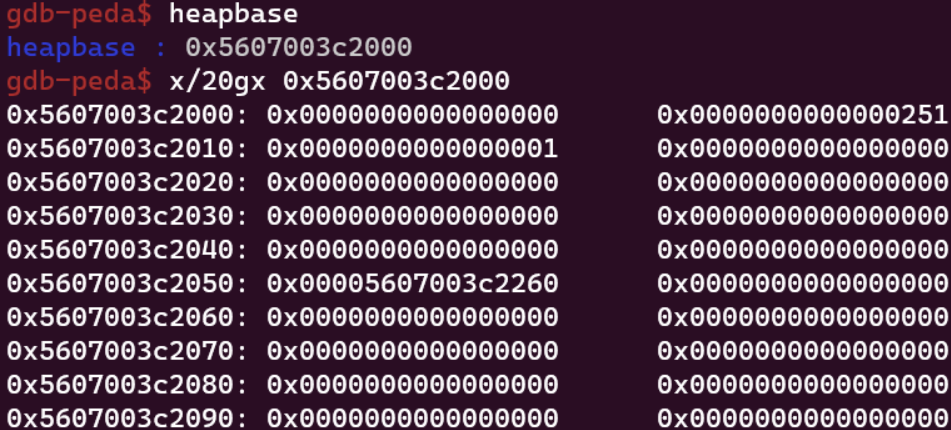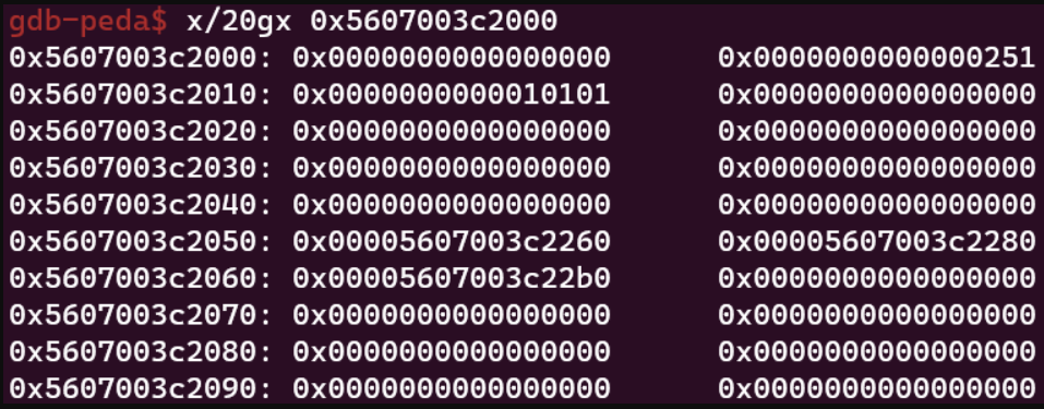 힙 페이지 시작 부분에 0x251 의 size를 가진 heap chunk가 존재하는 것을 알 수 있다. 이는 malloc 호출시 tcache_init 함수를 통해 tcache_perthread_struct 구조체가 힙 영역에 할당된 것이다.