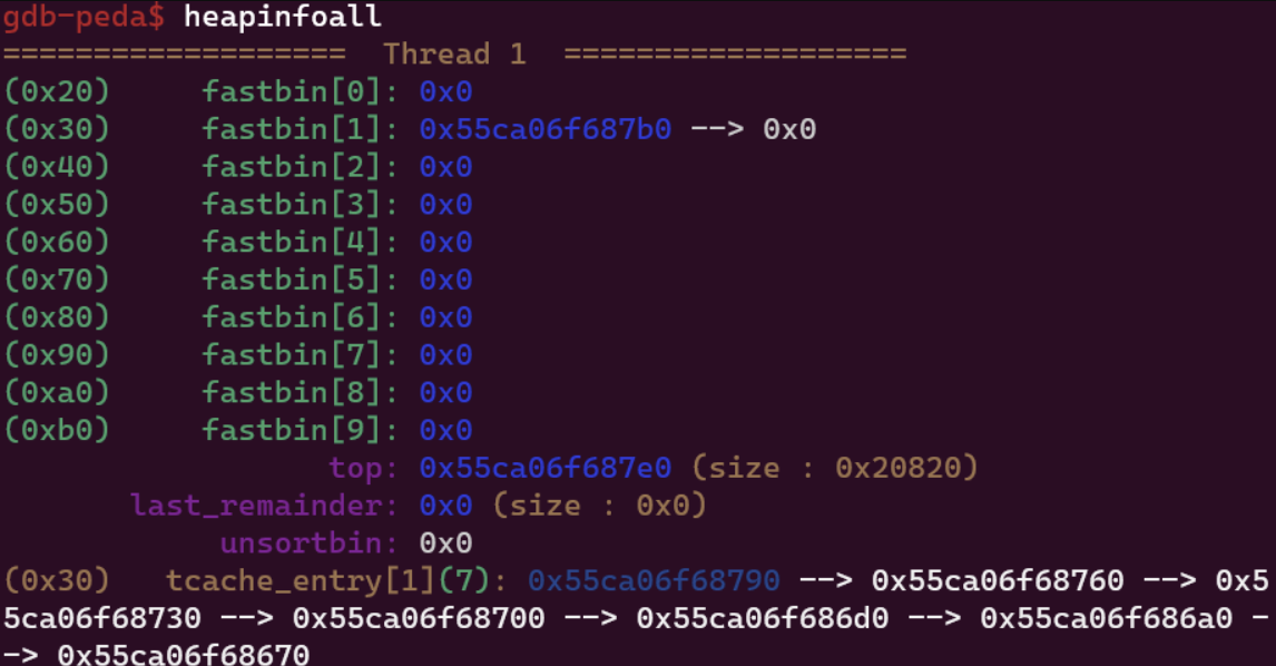 - 리눅스는 각 tcache에 보관할 수 있는 chunk의 갯수를 7개로 제한하고 있다.