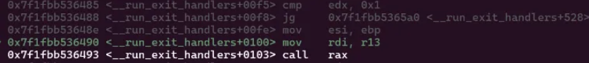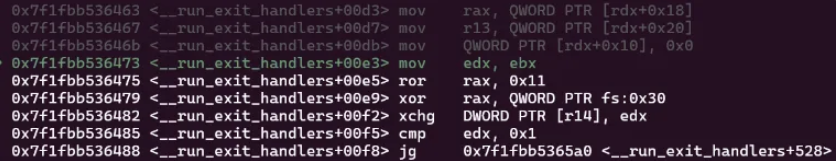 <원리> exit함수 내부의 __run_exit_handler 의 루틴에 initial+0x18 포인터 값을 가져와 demangling을 한다. demangling 과정은 0x11만큼 rotation right를 하고 fs_base+0x30의 값과 xor 한다. 그래서 1번 과정에서 fs_base+0x30 값을 0으로 overwrite하려고 시도하고 만약 aaw가 2번만 가능하다면 leak만 하고 initial+0x18에 xor을 해주면 되는 것이다. (일반적으로 initial+0x18에는 _dl_fini의 주소가 mangling 되어 들어있다) 암튼 그렇게 나온 함수에 initial+0x20을 인자로 하여 실행된다.